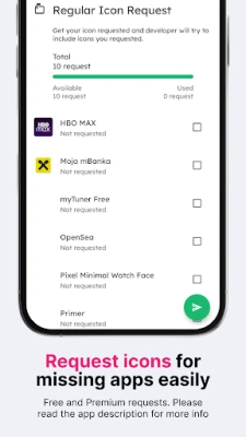 Open our app and click on the Request card. Check all icons you want to be themed and send requests by pressing the Floating Send button. You will get a share screen with options on how to share requests, and you need to choose Gmail (some other mail clients like Spark, etc., have problems attaching the zip file, which is the most important part of the email). When sending an email, DO NOT delete generated zip file or change the Subject and text in the body of the email – if you do that, your request will become unusable!