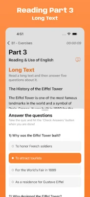 Get ready for the Cambridge B1 Preliminary English Test (PET) with this complete exam simulator. Designed for English learners, this app lets you take unlimited Reading & Use of English and Listening exams just like the real Cambridge Assessment. All the content is reviewed by professional English teachers to make sure you’re getting high-quality practice.