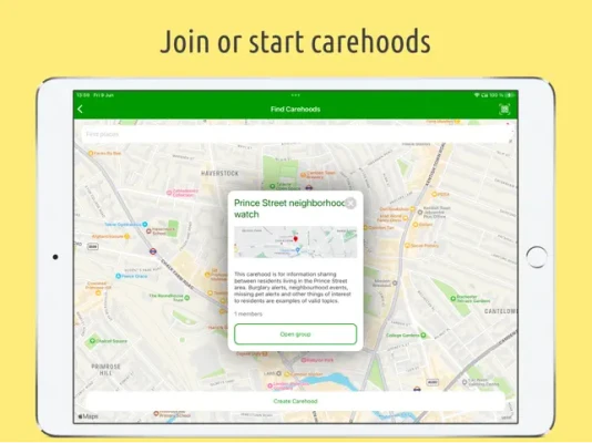 Anyone can start a carehood. As a new Carehood member you can search for interesting carehoods on a map in the app. When you apply for membership in a carehood one of the current members has to approve your application before you can join the discussions. You can start and join as many carehoods as you like and there are no limits on the number of members a carehood can have. The founder of a carehood is just a founder. People joining becomes members on the same terms as the founder.