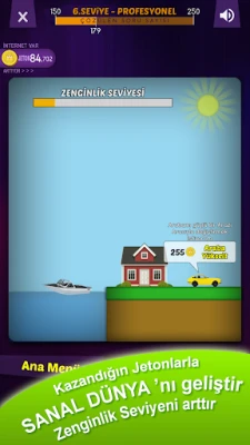 * Oyun parasıyla (JETON) "BONUS"lar alıp oyunu kolaylaştırabilirsin yada "Sanal Dünyam" bölümün Ev, Araba, Gemi, Helikopter, Uçak vs. alıp geliştir "Zenginlik Seviyeni" arttır.