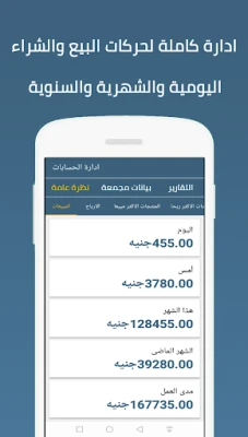 من خلال التطبيق يمكنك عمل لنفسك محاسبة يومية او شهرية او سنوية لتتابع اداء حركات البيع والشراء بمحلك او متجرك فتطبيق كاشير Cashier هو برنامج محاسبى وبرنامج وبرنامج مخازن وبرنامج حسابات وبرنامج كاشير وبرنامج ادارة المخازن وبرنامج ادارة المبيعات كل هذه البرامج المحاسبية فى تطبيق واحد برنامج محاسبة بين يديك.