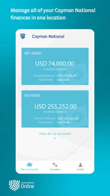 Welcome to Cayman National's new Mobile App, the easiest and most convenient way to bank. Available to you 24 hours a day, 7 days a week from the comfort of your own home, your office or anywhere you would like to bank. Plus, avoid waiting in the line at our locations.