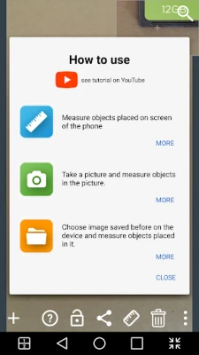 - Kamera Modu (Fotoğraf Cetvel) - Referans nesnesini kullanarak sonra ölçmek ve istediğiniz nesnelerin resmini çekmek, resimde tüm nesnelerin boyutunu ölçebilir