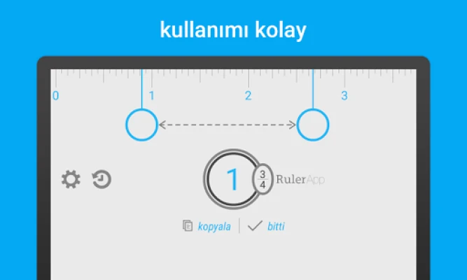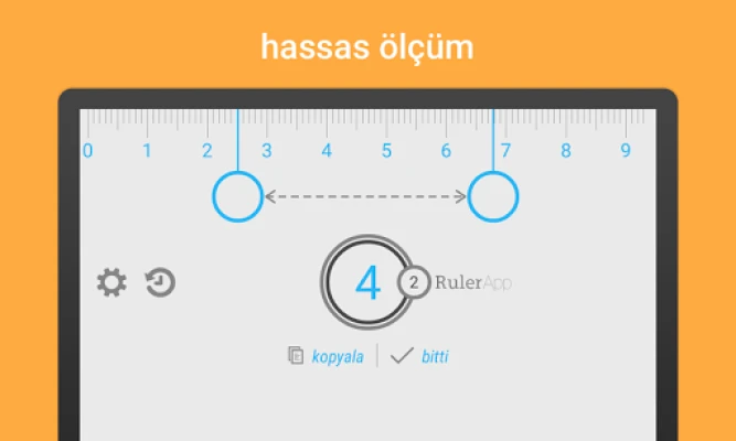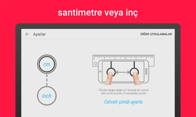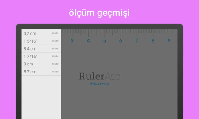 Telefonunuz ve tabletiniz için cetvel uygulaması. Ekran üzerindeki cetvelle her şeyi ölçün. İster inç, ister santimetre cinsinden ölçün. Ekrana dokunup bu en harika çok dokunuşlu ölçüm sistemini kullanmaya başlayarak etrafınızda merak ettiğiniz tüm nesnelerin ölçüsünü bulun. • Hassas ölçüm • Santimetre veya inç • Ölçüm geçmişi • Kullanımı kolay • Harika mobil cetvel • http://ruler.mobi internet sitesinde daha fazlası mevcut