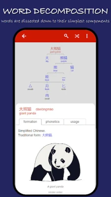 The app uniquely deconstructs Chinese characters and words down to their simplest components, providing a clear link between each component, with memory aids provided for every word and character.