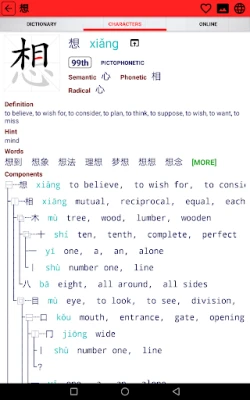 • Quick Cross-referencing: tap on any character or word in any dictionary entry to show relevant words intelligently and bring up its definition.