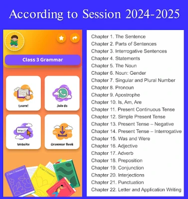 Class 3 English Grammar Guide and book for 2024-25. The content of chapters are easy to read and understand. At the end of each chapter, the practice exercises and test are added for revision.