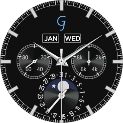 A watch face designed for Wear OS that shows local time, battery percentage, and step count.