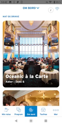 Se informasjon om butikker, aktuelle tilbud, restauranter, barer, underholdning og aktiviteter om bord, se hvilke steder vi passerer, lag din egen tidslinje og få påminnelser om hva som skjer.