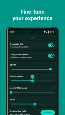 It features modern Material You design that adapts to your system theme and changes with it. You can configure cells of the Game to your liking by setting up their roundness, border width and color. Setting up speed of the animation and overall scaling of the grid is also helpful to observe the Game itself, with it's endless complexity and beauty.