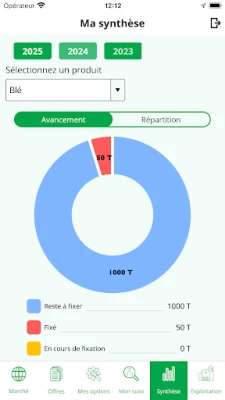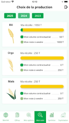 Avec CoopCreully’Connect, suivez de près la commercialisation de vos récoltes grâce à un service de suivi des données alimentées par la coopérative ou saisies par vous-même. Consultez les cotations Euronext actualisées pour le blé, le maïs, le colza et bien plus encore. Recevez des informations de marché en temps réel et consultez les détails de votre commercialisation, y compris vos contrats de vente par culture et les critères qualitatifs de livraison.