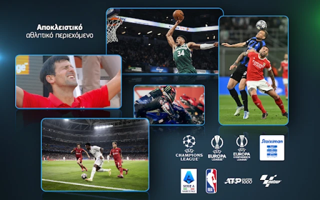 Απόλαυσε την απόλυτη ψυχαγωγία με εξαιρετικό περιεχόμενο, αγώνες από τα κορυφαία πρωταθλήματα του κόσμου σε Full HD και 4k ανάλυση, τις πιο πρόσφατες ταινίες από ένα πλούσιο κατάλογο, συναρπαστικές σειρές, ντοκιμαντέρ από κορυφαίους παραγωγούς και παιδικά προγράμματα, καθώς και μια μεγάλη γκάμα ζωντανών μεταδόσεων από Ελληνικά και διεθνή κανάλια.
