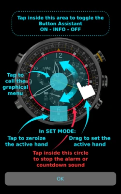 Since Cronosurf has many features, the app includes a comprehensive user manual. The Button Assistant (also available on the web version) labels each button according to the momentary state of the watch and helps you to quickly get familiarized with the basics. To activate it, simply tap on the area above the watch.