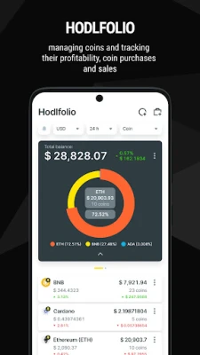 Hodlfolio displays both the overall balance and the value of each asset separately. You can select a period and calculate the profitability of holding coins. The portfolio total value can be displayed in fiat currencies and in cryptos.