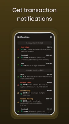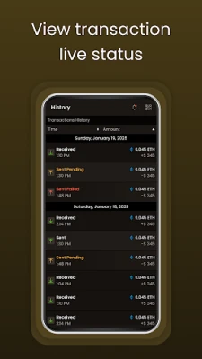 View your past transactions with detailed records of sends, receives, and swaps.