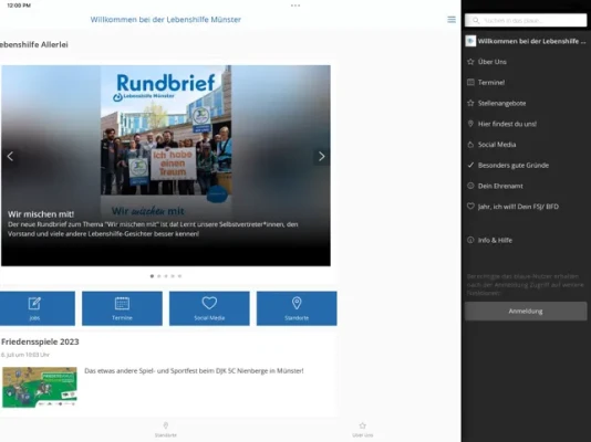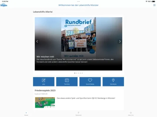"das blaue" – die Lebenshilfe Münster-App bietet Neuigkeiten und Informationen rund um die Lebenshilfe Münster. Als Selbsthilfe- und Elternvereinigung sowie moderner Träger von Diensten und Leistungen für Menschen mit Behinderung und deren Familien bieten wir bedarfsorientierte Formen der Unterstützung. Folgende Informationen erwarten Sie in unserer App: