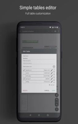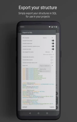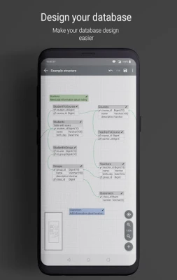 You can create tables, keys, columns, and change parameters, colors for it, and many others. For creating SQL just tap one button and use SQL in your database. If you want to show scheme somebody, just exports in a picture and sends it. Without ads.