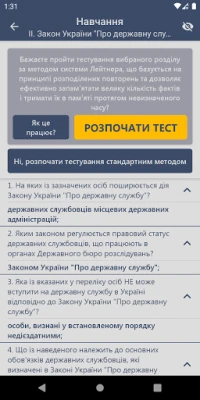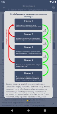 Ефективне вивчення питань реалізовано методом Лейтнера, який дозволяє вивчити та тримати в пам’яті вивчений матеріал невизначену кількість часу. Це досягається завдяки частішому повторенню користувачем питань, у відповідь на які він частіше помиляється. В цьому додатку Ви зможете не тільки вивчати матеріал і проходити тести, але і побачити порівняння Ваших результатів із результатами інших користувачів, що проходять тестування.