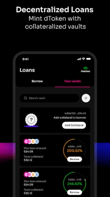 Unlock more financial potential with trust-less decentralized loans and access dTokens with collateralized vaults on the blockchain. Gain access to collateral tokens at a great value by participating in auctions for liquidated vaults.