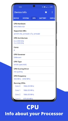 • Processor, CPU Hardware, Supported ABIs, CPU Architecture, Cores, CPU Family, CPU Governor, Frequency, CPU Usage, BogoMIPS.