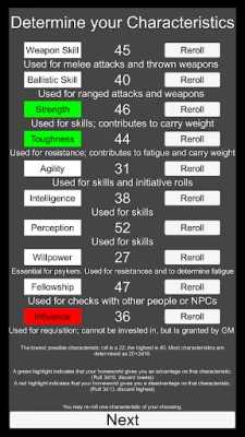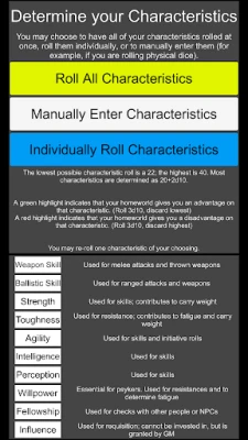 With this application you will be able to create characters quickly and easily, choosing between the different options of origin, role, background, aptitudes, talents, equipment and more. You will be able to customize every aspect of your character, from his name and appearance to his alignment and motivation. In addition, you will be able to keep track of their attributes, abilities, injuries, corruption, madness and experience.