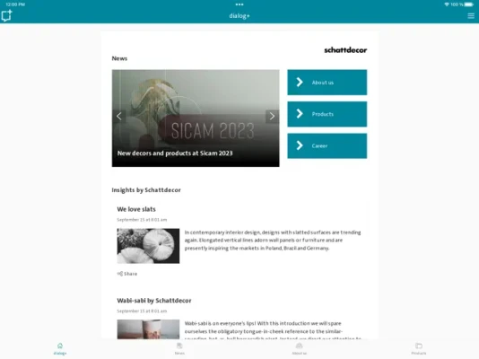 This is where users can find the latest news and stories from the world of Schattdecor. The app contains all important information on products, trade shows, events and company news.