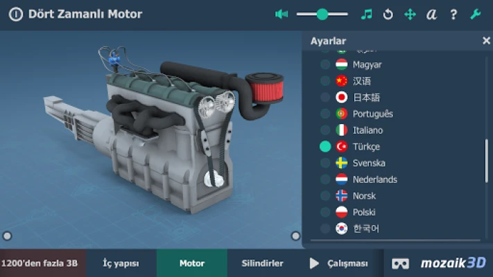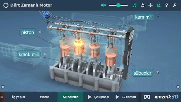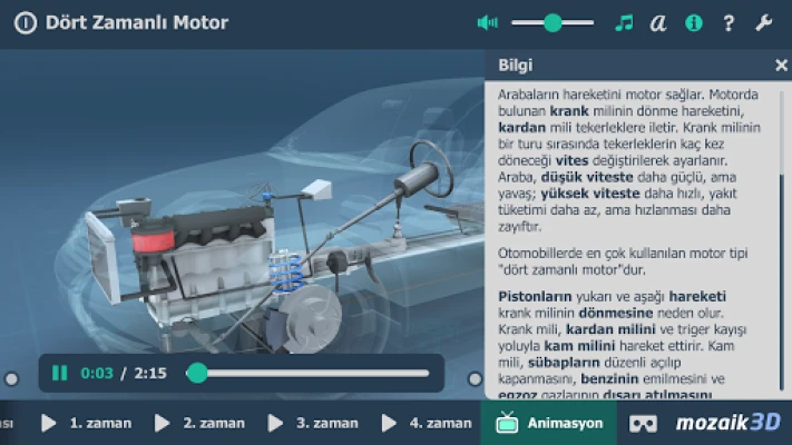 Animasyon, otomobillerde en çok kullanılan motor tipinin çalışması gösteriliyor. Uygularımızla öğrenme eğlenceli hale gelir.