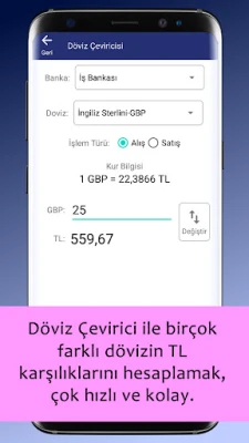 - Döviz Çeviricisini kullanarak istediğiniz birçok farklı ülkenin para birimi ve Türk Lirası dönüşümlerini kolay bir şekilde yapabilirsiniz.