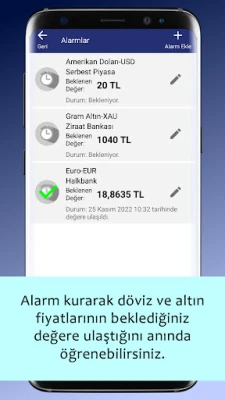 - "Alarm" kurarak, takip ettiğiniz döviz/altın piyasasının, beklediğiniz değere ulaştığını kolayca haber alabilirsiniz.