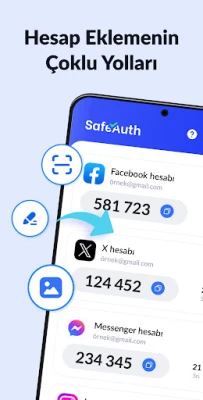 SafeAuth, 2 adımlı doğrulama yöntemiyle tüm online hesaplarınızı cihazınızda güvence altına alır. Her giriş için benzersiz zaman tabanlı tek kullanımlık şifreler (TOTP) oluşturarak, yalnızca yetkili kullanıcıların hesabınıza erişmesini sağlar.