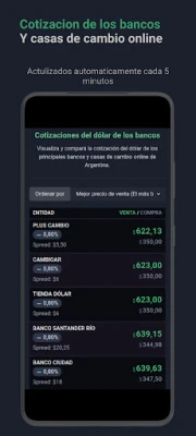- La cotizacion de distintos tipos de cambio: Dolar, Euro, Real, USDT Cripto y entiendades bancarias.