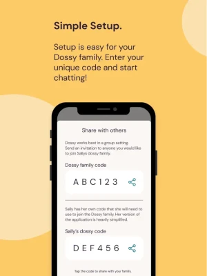 Setup is easy for your Dossy user. Once you have set up the family group, they download the iOS app and enter their unique Dossy code. Available friends and family will appear instantly. No email, no credit card, no contact syncing or scraping.