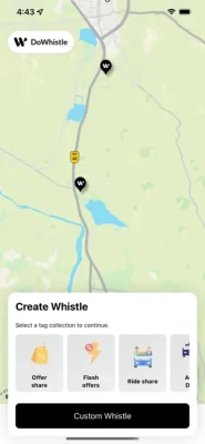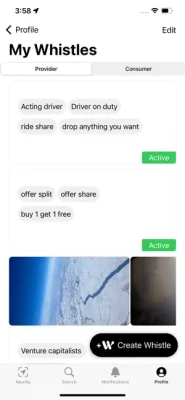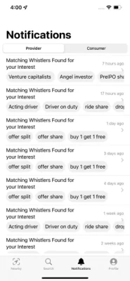 Consumers can see all the registered providers around anonymously or register and create whistle to get notified when a provider with a matching tag is nearby.