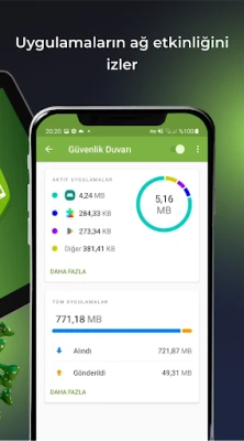 • Geçerli ve daha önce iletilen trafiği izler; uygulamaların bağlandığı adresler/portlar ve gelen ve giden trafik miktarı hakkında bilgi sağlar.