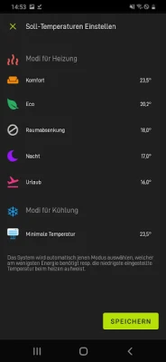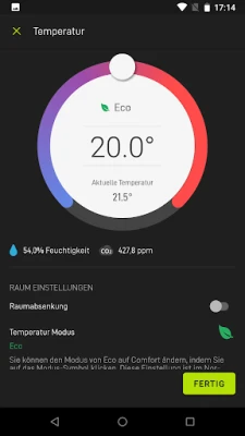 Prüfen Sie die aktuelle Temperatur in den Räumen, wählen bequem zwischen Comfort- und Eco-Temperatur in jedem Raum und stellen die gewünschte Temperatur für jeden Mode und Raum ein.
