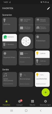 - Favoriten: In den Favoriten werden die wichtigsten Szenarien des ganzen Apartments angezeigt. Und Sie können Ihre persönlichen Favoriten hinzufügen. Dies können sowohl Szenarien aus den Räumen, einzelne Geräte oder benutzerdefinierte Handlungen sein.