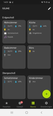 Die App verfügt über vier Tabs (Favoriten, Cockpit, Raumübersicht, Einstellungen), die Ihnen dabei helfen, schnell zwischen den verschiedenen Funktionen zu wechseln: