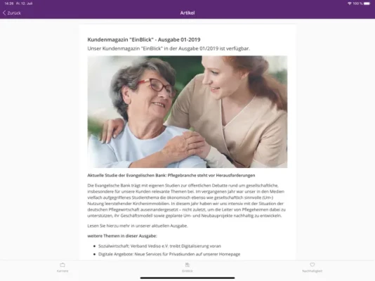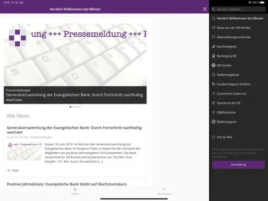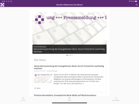 EBnow ist die digitale Kommunikations-App der Unternehmensfamilie der Evangelischen Bank eG. Die App stellt aktuelle Informationen zur Unternehmensfamilie zur Verfügung und bietet ihren Usern die Möglichkeit, Artikel zu kommentieren, zu liken oder zu teilen.Interessenten erhalten weitreichende Karriereinformationen sowie einen direkten Zugang auf das Stellenportal. Kunden und Partnern bietet die App mit der Bereitstellung des Kundenmagazins EinBlick einen zusätzlichen Mehrwert. Für Mitarbeitende stehen weiterführende Informationen in der EBnow zur Verfügung.Bei Fragen und Anregungen erreichen Sie uns über ebnow@eb.de.