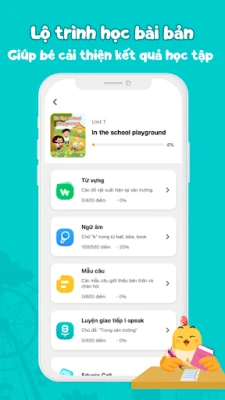 d. Mỗi Unit tiếng Anh bao gồm 4-5 buổi học từ vựng theo chủ đề, mẫu câu, phát âm và bài tập nâng cao hình thành cho bé thói quen chủ động trong việc học tập