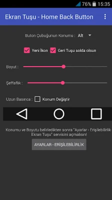 Nasıl kullanılır ? - uygulamayı açtıktan sonra izin isterse onayla - konum, boyut vs. ayarla - "Ayarlar - Erişilebilirlik" tuşuna tıkla - "Ekran Tuşu - Home Back Button" u bul ve aktifleştir