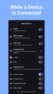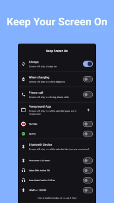 - 📱 Belirli Bir Uygulama Önde İken Ekran Açık: Açık olduğunda ekranınızı uyanık tutması gereken uygulamaları seçin.