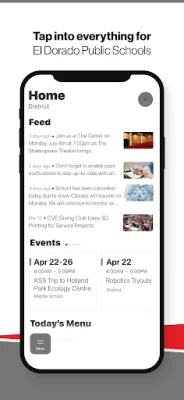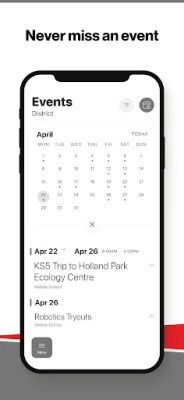 NEVER MISS AN EVENT The event section shows a list of events throughout the district. Users can add an event to their calendar to share the event with friends and family with one tap.