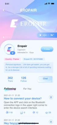 Eropair is an online shopping and mobile social app based on Eropair brand sex toys.We are committed to giving you the ultimate pleasure.Main function:Device control:Connect to Eropair branded sex toys via Bluetooth and use the diverse control features