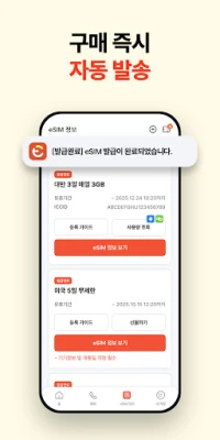 이심이지의 e심 사용 시 한국 번호 그대로 전화 발신이 가능해요. 해외에서 한국으로, 해외에서 해외 현지로 로밍 요금과 유심 분실 걱정 없는 자유로운 국제전화 누려보세요! 네이버, 쿠팡, G마켓, 카카오 등 앱이 아닌 곳에서 이심 구매했어도 걱정 마세요! eSIM 구매 내역을 등록하시면 어디에서 이심 구매하셨든 한국 번호 그대로 전화할 수 있어요.