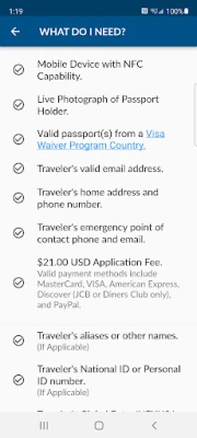 The Electronic System for Travel Authorization (ESTA) app from U.S. Customs and Border Protection allows Nationals of Visa Waiver Program (VWP) countries to apply and pay for a travel authorization without a visa. The ESTA app is a mobile version of the ESTA application process and information that can also be found on the ESTA website at https://esta.cbp.dhs.gov.