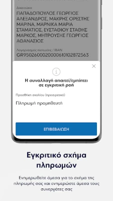 Εγκριτικές ροές: Πλήρης έλεγχος του εγκριτικού σχήματος της εταιρείας σας με αποστολή ειδοποιήσεων για έγκριση καθώς και ολοκλήρωση συναλλαγών. Με το πάτημα ενός κουμπιού, εγκρίνετε ή απορρίπτετε συναλλαγές που λαμβάνετε για έγκριση, μεμονωμένα ή μαζικά έως και 20 συναλλαγές μαζί.