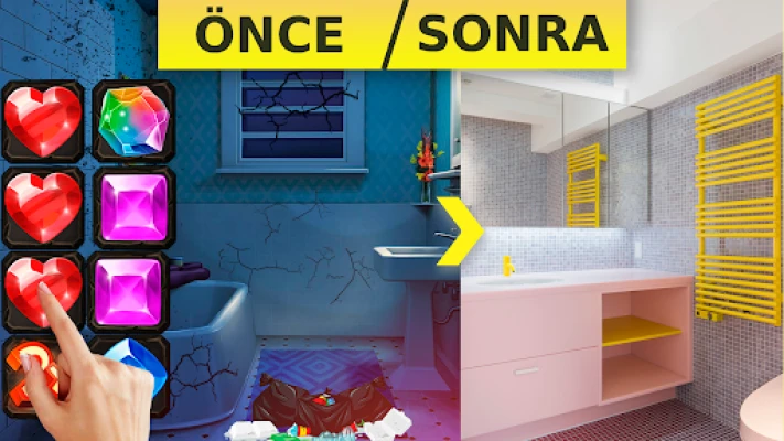 Bu rahatlatıcı ücretsiz 3'lü eşleştirme patlatma bulmaca oyunlarıyla yenileyin, yeniden tasarlayın, ev onarımını yapın ve zorlu bulmacaları çözün! Her şeyi istediğiniz gibi yeniden tasarlamaya, yeniden oluşturmaya ve özelleştirmeye hazır olun. Ev tasarımı: Ev tadilatı, evinizin çeşitli bölümlerinin yenilenmesini yöneteceksiniz: evinizin cephesi, odaları, mutfağı ve çok daha fazlası! Ev makyajını tamamlayın ve tonlarca ödül kazanın!