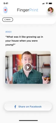 After you create an account, you can add the family members or friends that you would like to have access to your memory timeline. Then you will see a question prompt from the app (i.e. what's your favorite childhood memory? who was your first love? what's your favorite comfort food?), daily, weekly, or monthly...and when the question comes up on your screen you can tap record and it pulls up your phone camera so that you can create a video response to the question.This video, or "memory" then gets placed in your timeline, and your family/friends get alerted that you dropped a new memory in the timeline to view. There's also an option to share it to facebook. All your memories from your loved ones now in one place.