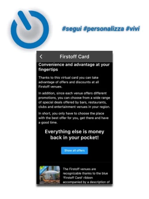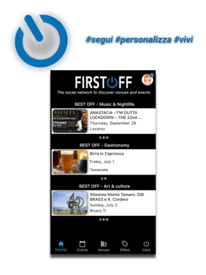 Firstoff, find your event. The social network to discover places and events. • Set your interests, we will find targeted content for you. • Follow the venues you like the most, by activating the notifications you will see their new events, menus and offers in real time. • Request the voucher-code in one of the affiliated venues to activate your personal FirstoffCard, you will now get discounts and offers in all Firstoff venues!