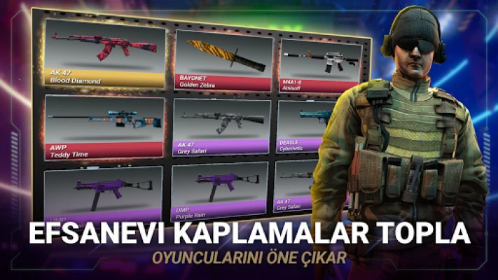 Ekipmanını özelleştir ve rakiplerini kıskandırmak için epik ve efsanevi silah kaplamaları, karakterler ve çıkartmalarla gösteriş yap. Oynadıkça, oyuncularının pro gibi görünmesini sağlayan daha büyük ve daha iyi kaplama kutularının kilidini açarsın.